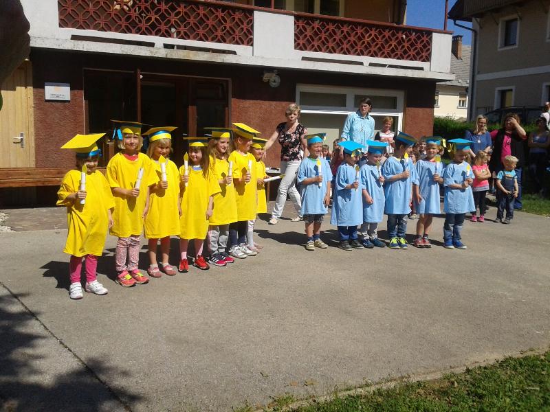 Otroci, ki letos zapuščajo vrtec in odhajajo v šolo pa so prisotne presenetili z maturantsko pesmijo in čisto pravimi oblačili in dodatki, ki so značilni za male in velike maturante.